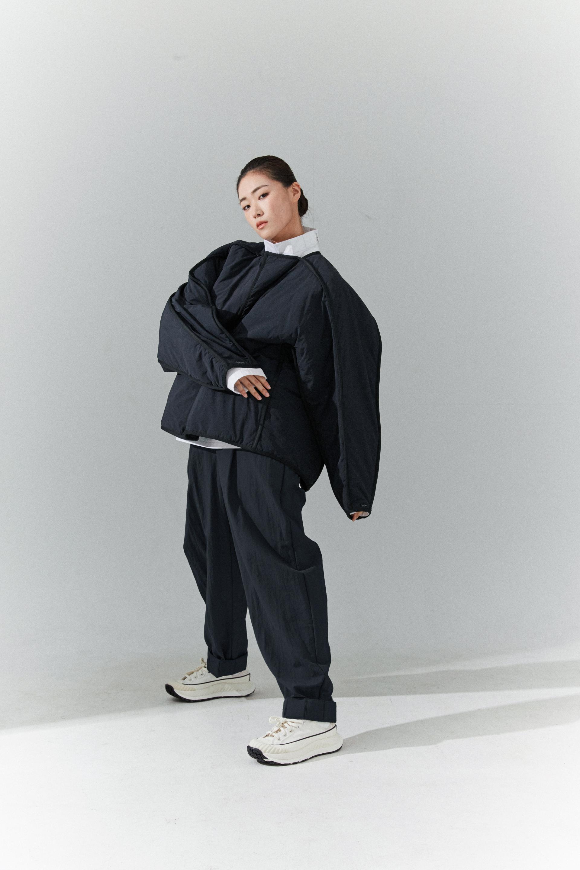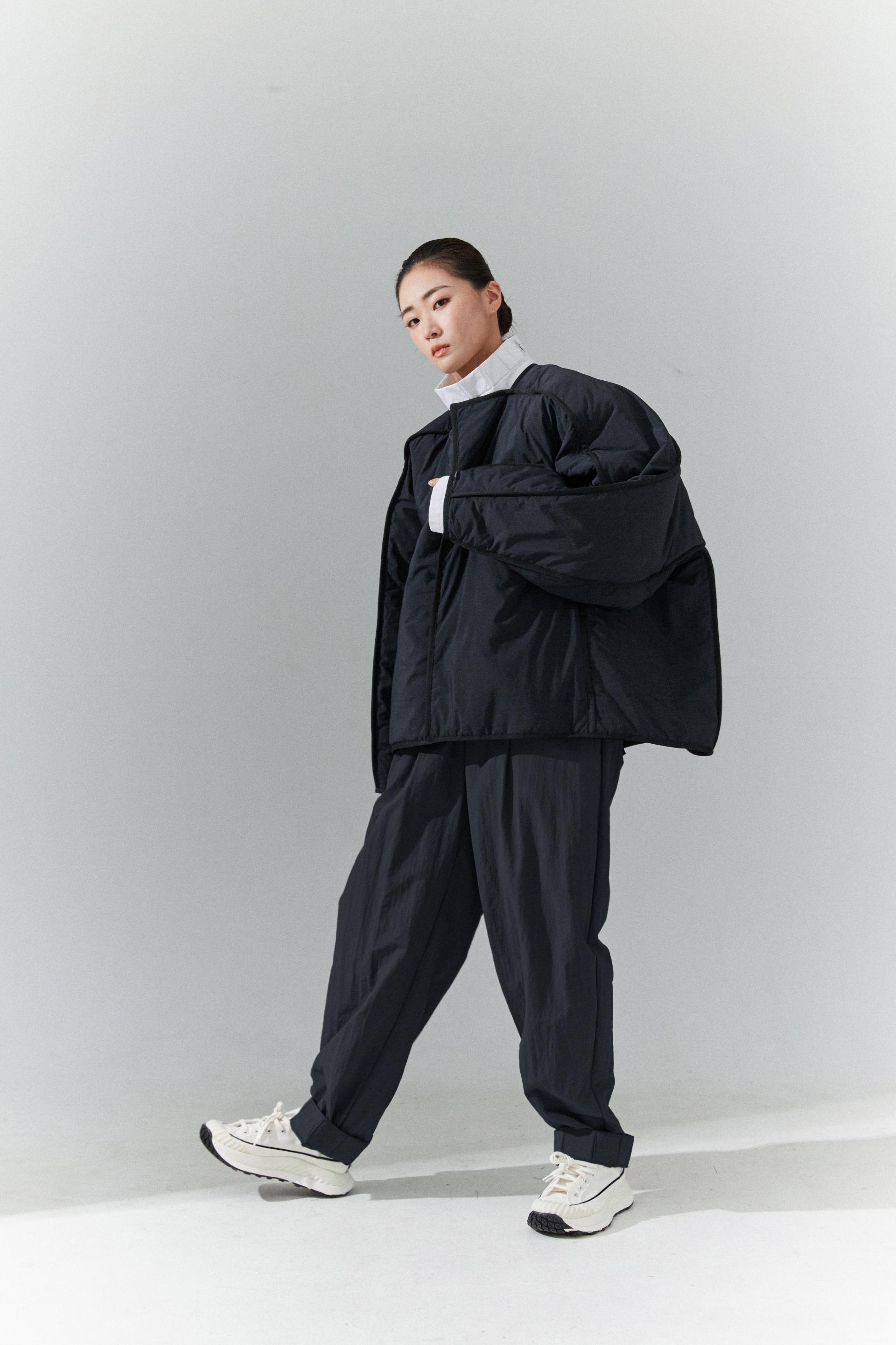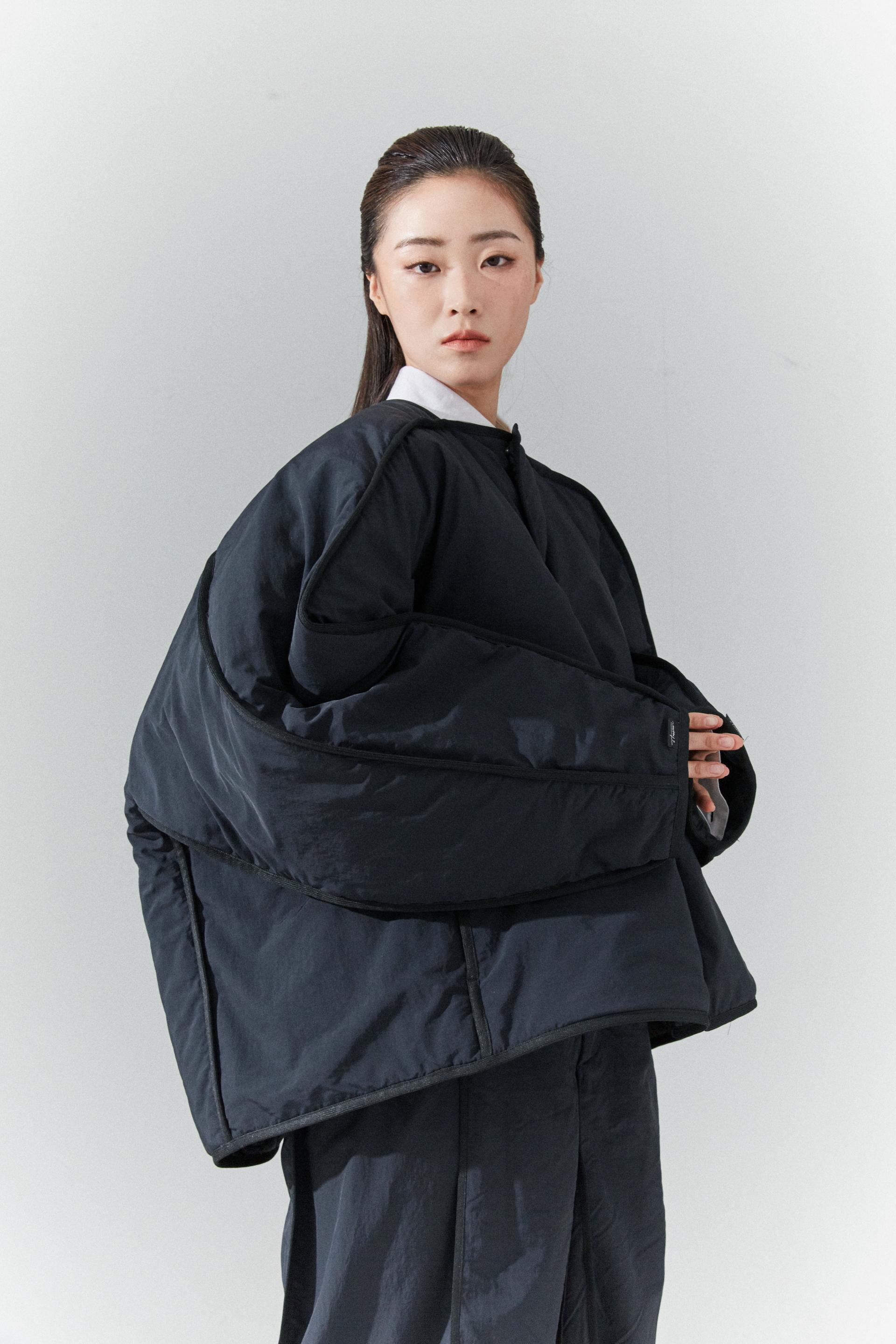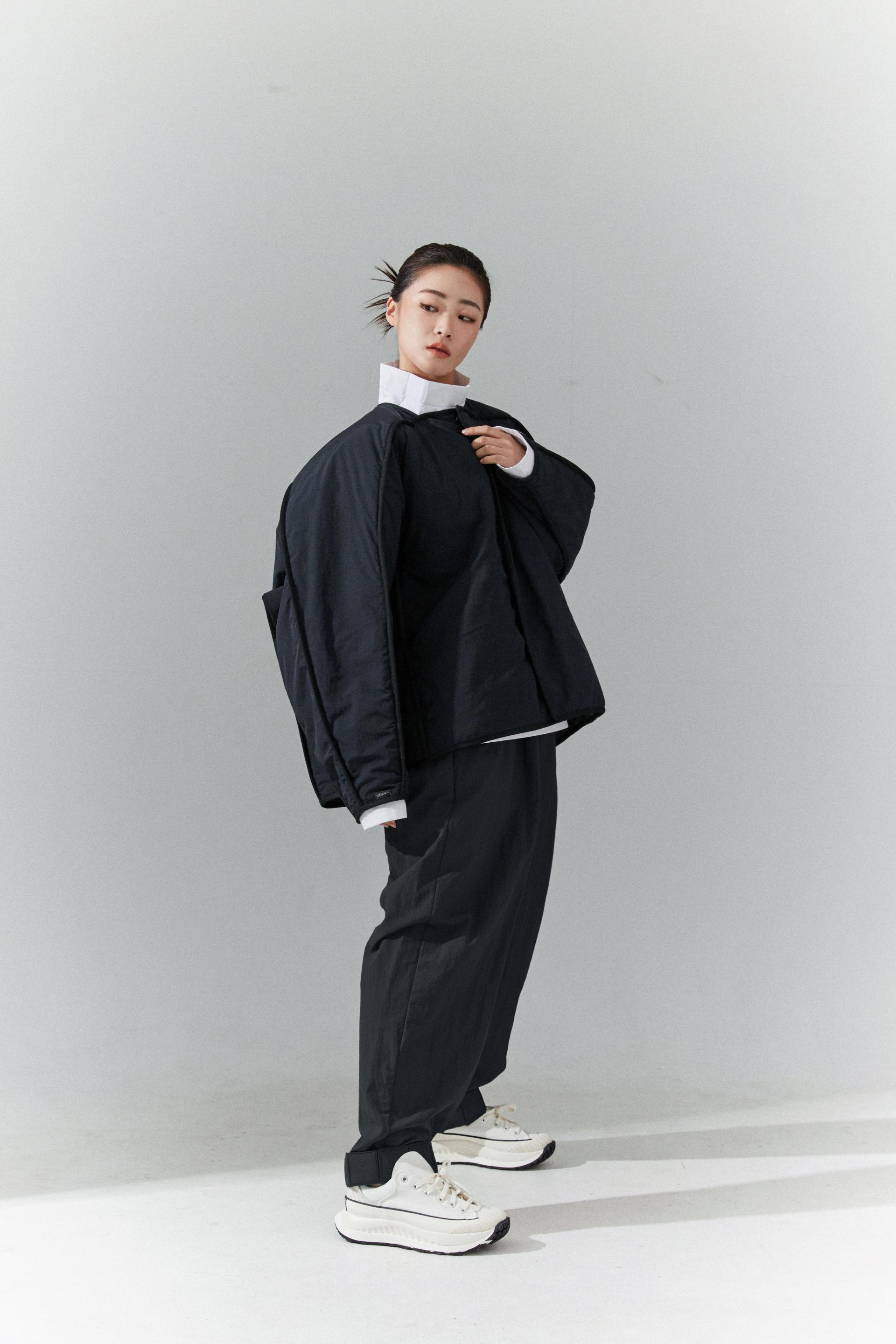 전면에 투웨이지퍼, 전면과 옆면사이 모서리와 안쪽에 각각 주머니 디테일 적용