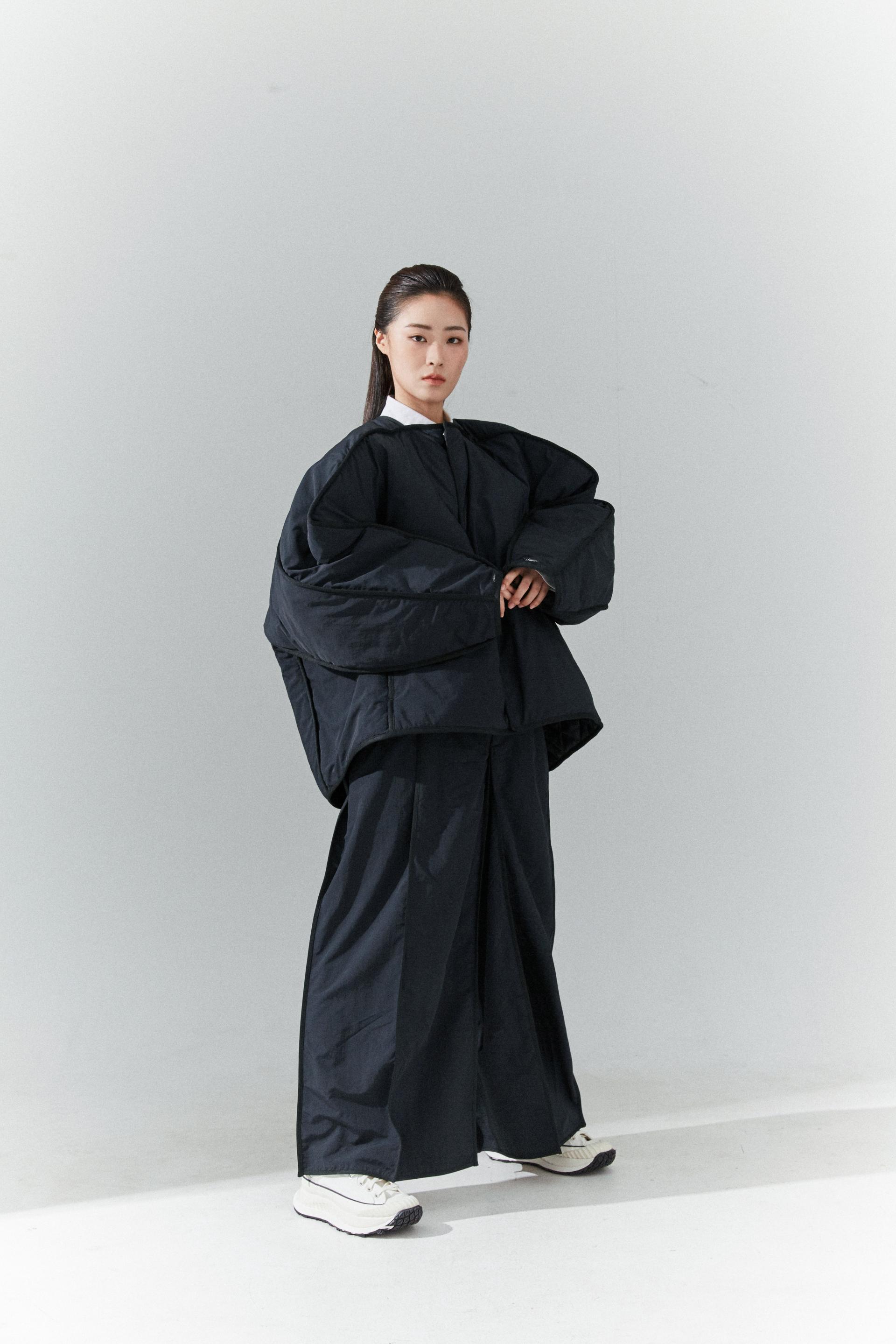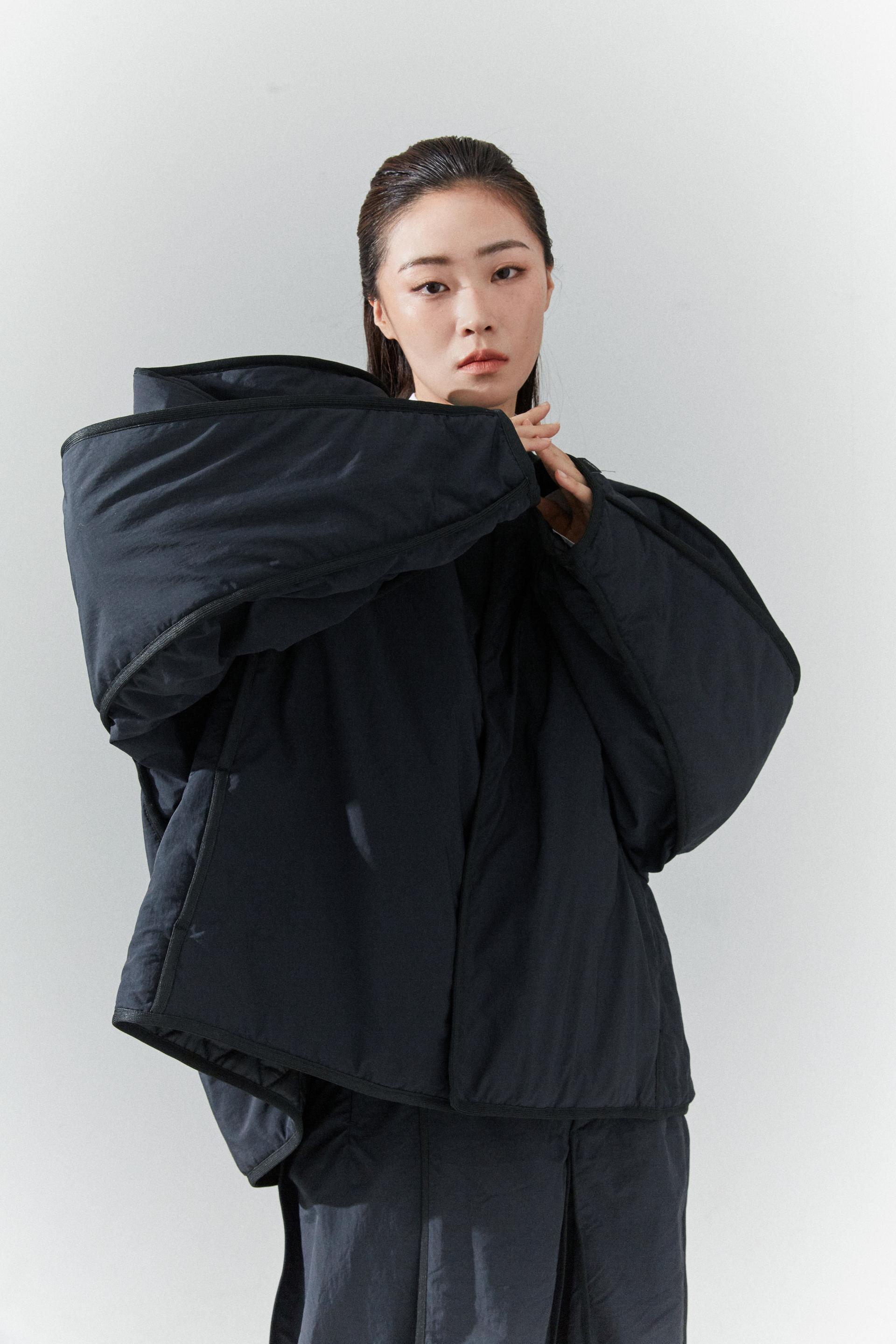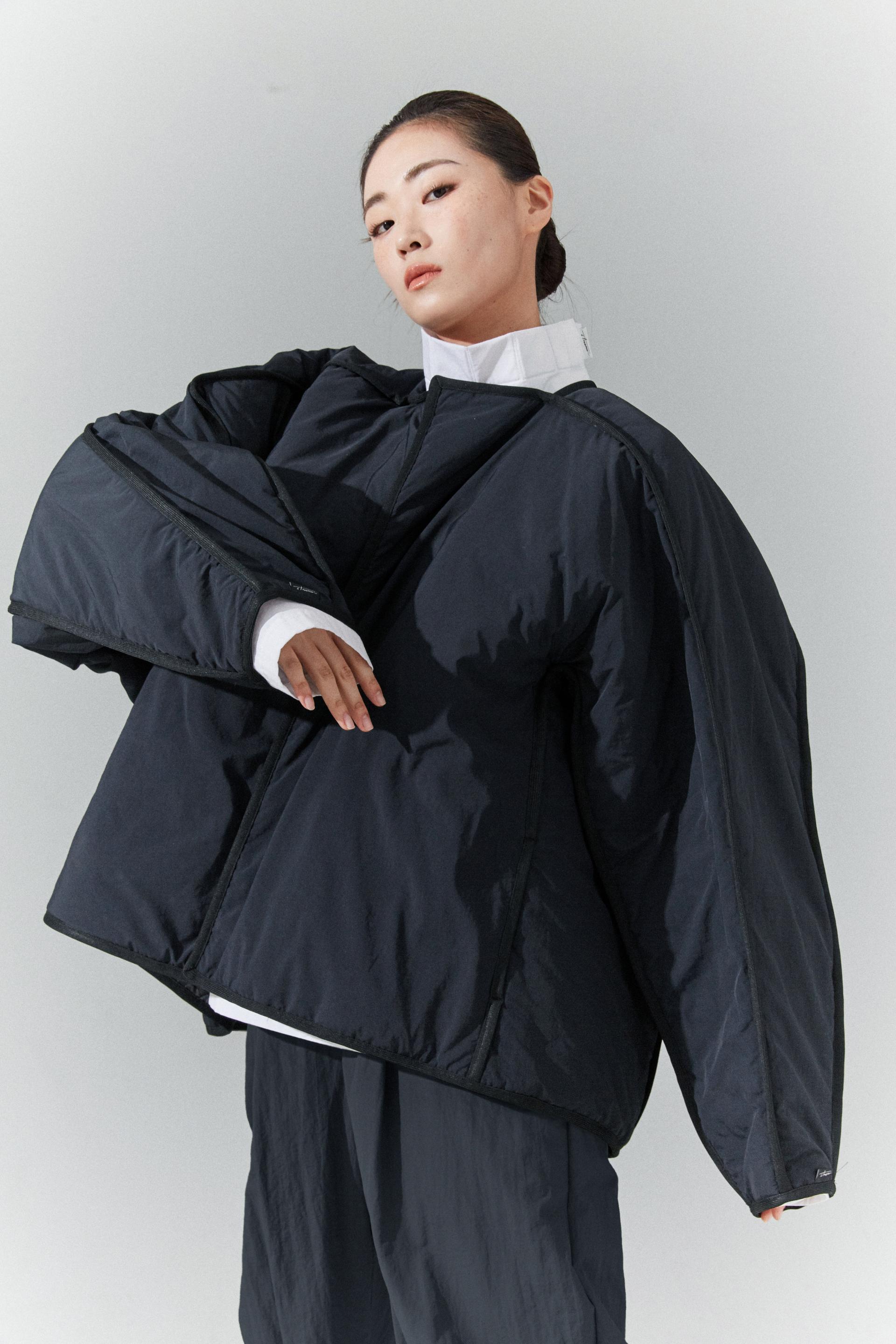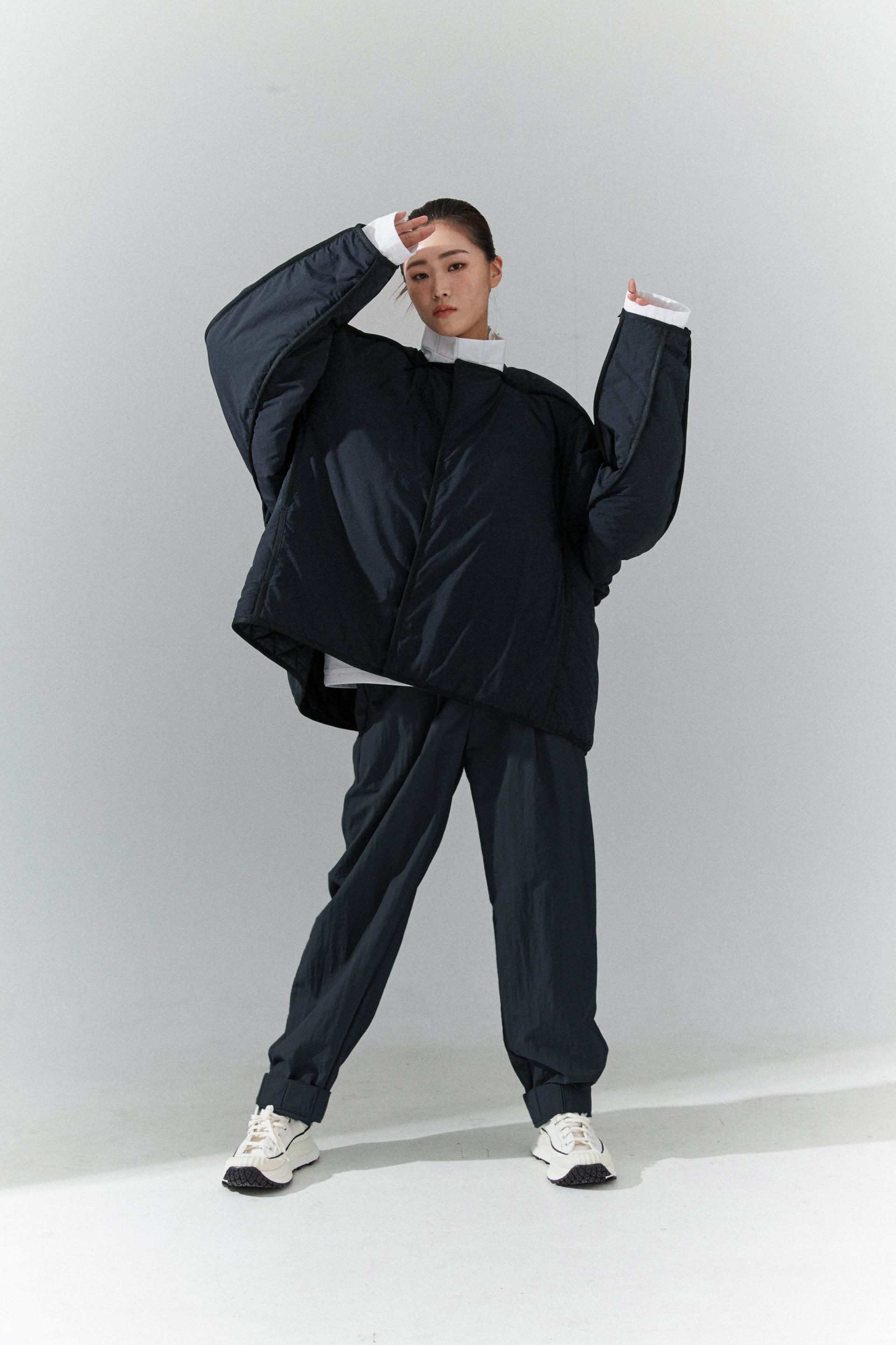 전면에 투웨이지퍼, 전면과 옆면사이 모서리와 안쪽에 각각 주머니 디테일 적용